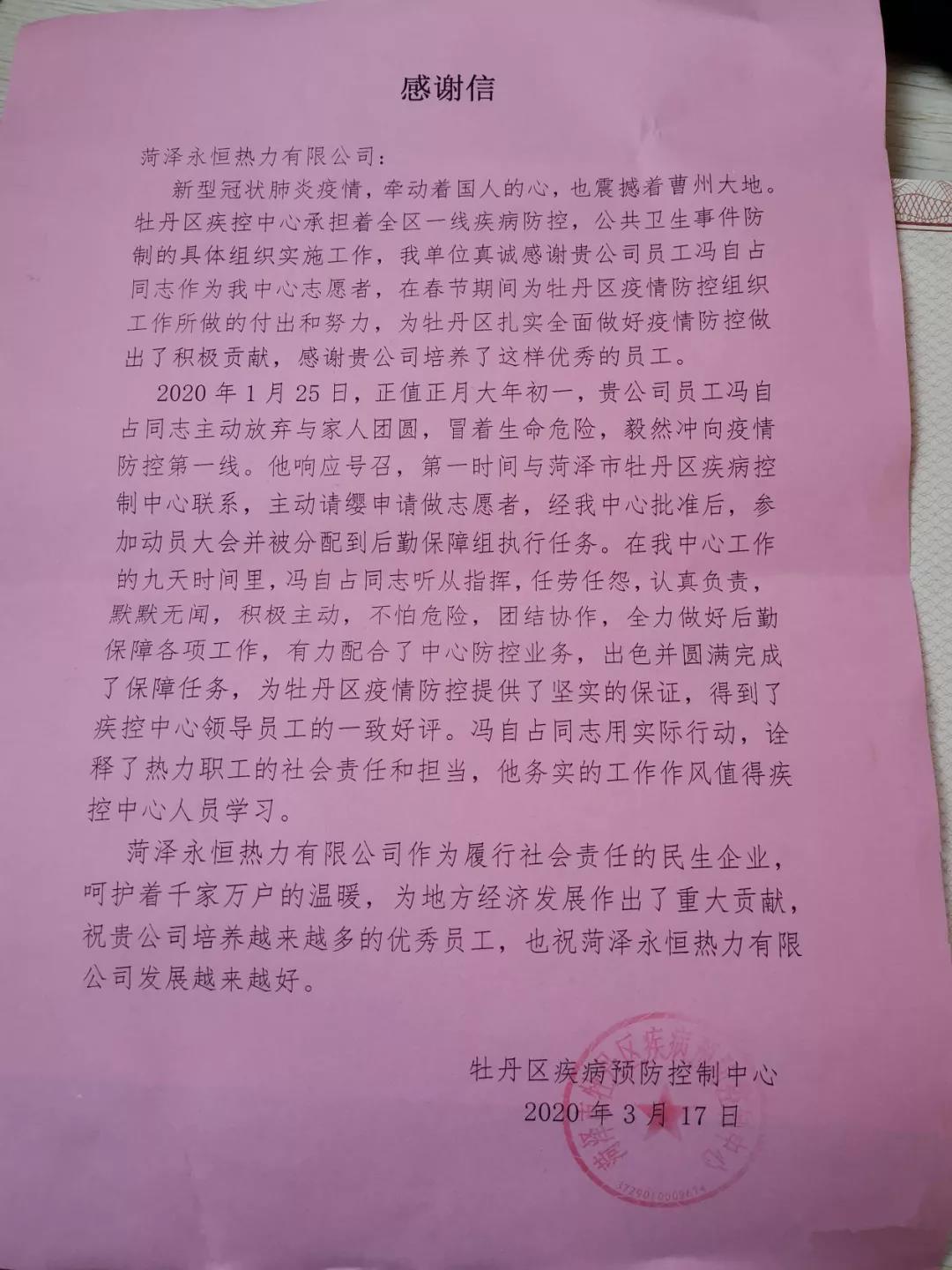 2020年初,疫情來襲,牽動著國人的心,也深深牽動永恒熱力運營管理二部管理員馮自占的心,一夜輾轉(zhuǎn)反側(cè)后,他第一時間與菏澤市牡丹區(qū)疾病控制中心取得聯(lián)系,主動請纓申請做志愿者,經(jīng)批準(zhǔn),被分配到后勤保障組執(zhí)行任務(wù)。1月25日,正值正月大年初一,馮自占主動放棄與家人團圓,冒著生命危險,義無反顧沖向疫情防控第一線。“我不是醫(yī)生,不能再次奔赴前線,救危難于生死,那我就多做些力所能及的事情”,事實上馮自占也是這么做的,他出色并圓滿完成了保障任務(wù),被牡丹區(qū)疾病預(yù)防控制中心授予了“新型冠狀病毒肺炎防控優(yōu)秀志愿者”稱號。