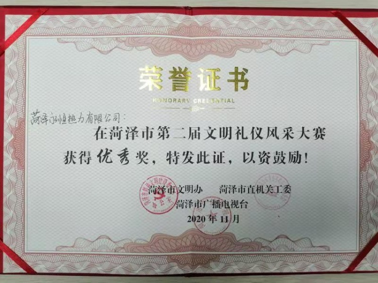 11月26日,由市文明辦、市直機關(guān)工委、市廣播電視臺舉辦的“菏澤市第二屆文明禮儀風(fēng)采大賽頒獎典禮”在菏澤市廣播電視臺演播大廳舉行。菏澤永恒熱力有限公司榮獲菏澤市第二屆文明禮儀風(fēng)采大賽優(yōu)秀組織獎。