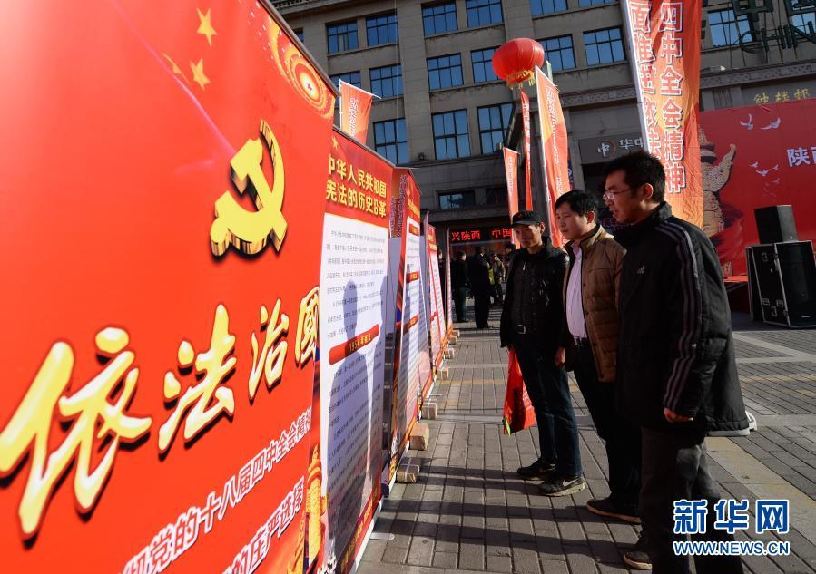 西安市民在國家憲法日宣傳活動(dòng)現(xiàn)場(chǎng)觀看依法治國宣傳展板(2014年12月4日攝)。新華社記者 李一博 攝